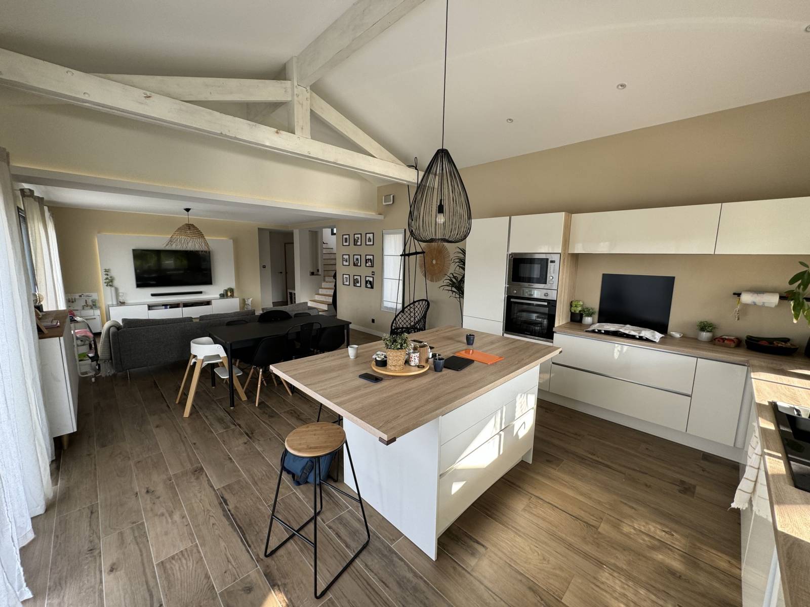 La maison se compose d’un espace de vie spacieux et lumineux, idéal pour accueillir famille et amis, avec un salon ouvert sur la salle à manger et la cuisine. Les grandes baies vitrées offrent une vue agréable sur la piscine et le jardin, prolongeant la sensation d’espace et de lumière.