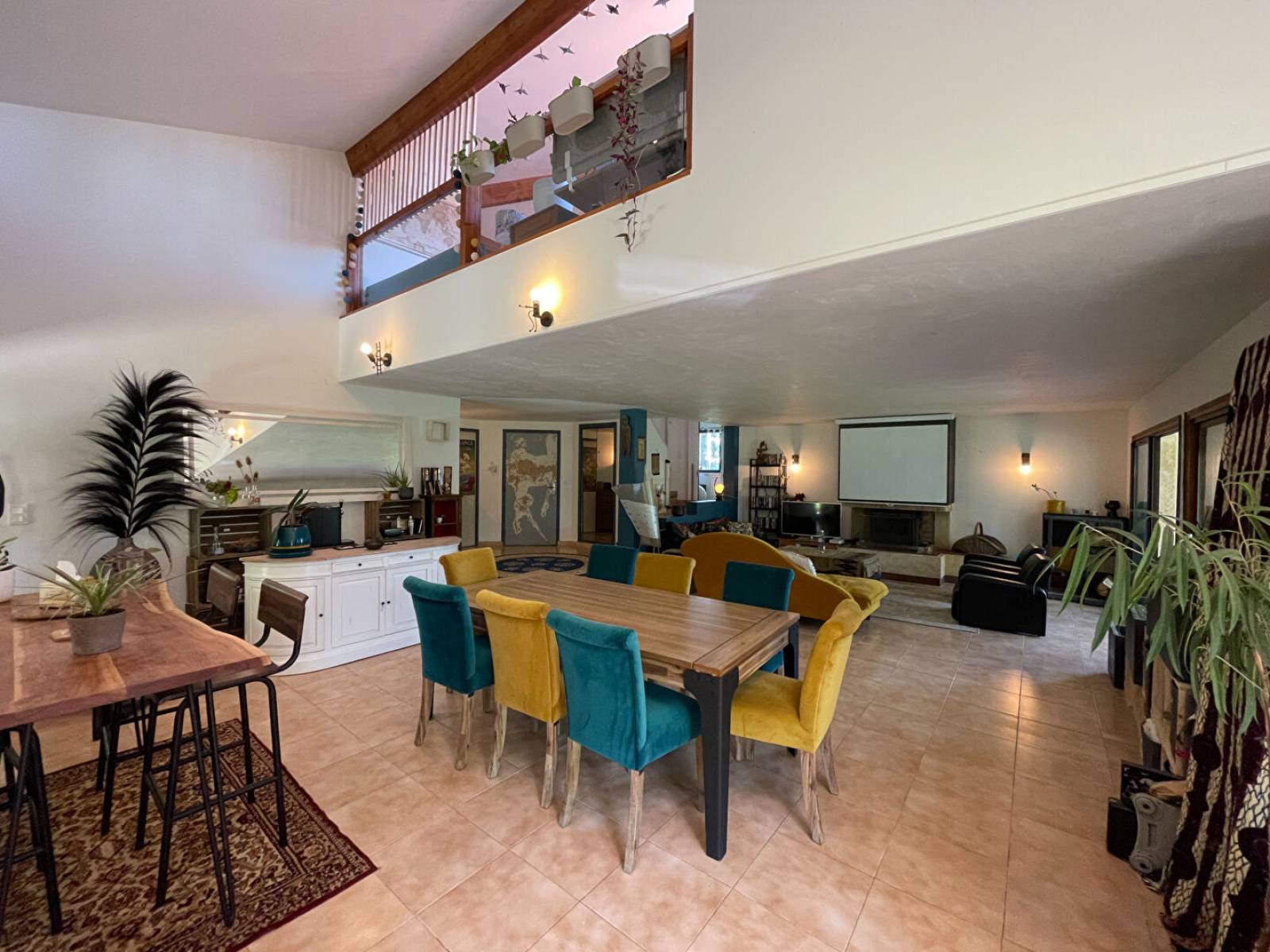 Depuis l'entrée avec wc indépendant, on accède à la spacieuse pièce vie d'environ 60 m² en partie déplafonnée. Le coin salon dispose d'une belle cheminée insert, le coin repas quant a lui peut facilement accueillir une grande table. De plus, vous avez accès à deux grandes vérandas qui vous proposent de beaux espaces supplémentaires de détente avec une vue sans aucun vis-à-vis sur le jardin.