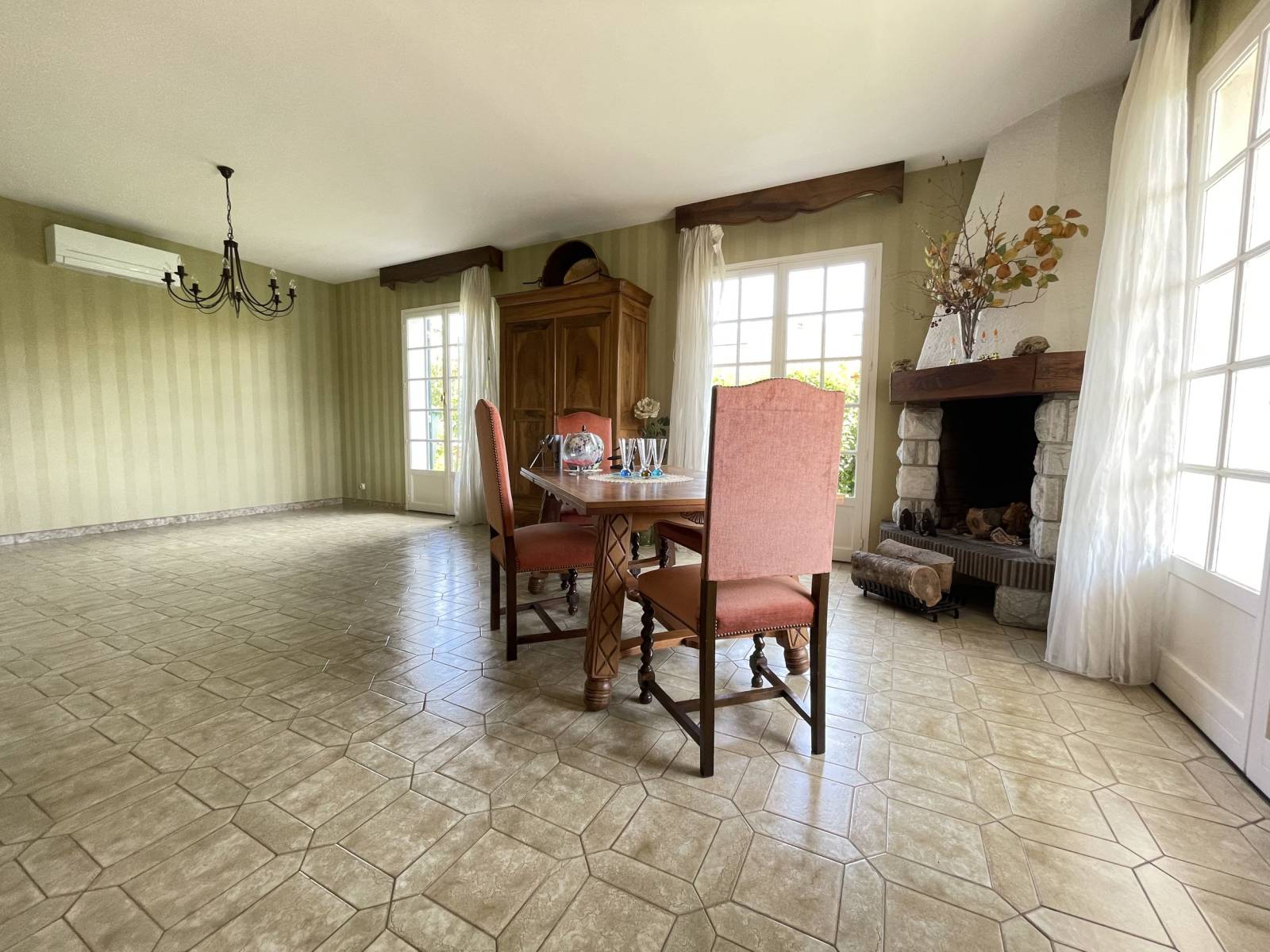 Elle se compose d'une entrée donnant accès à un séjour lumineux d'environ 31 m² avec cheminée et d'une cuisine indépendante d'environ 14 m² avec accès sur le jardin.