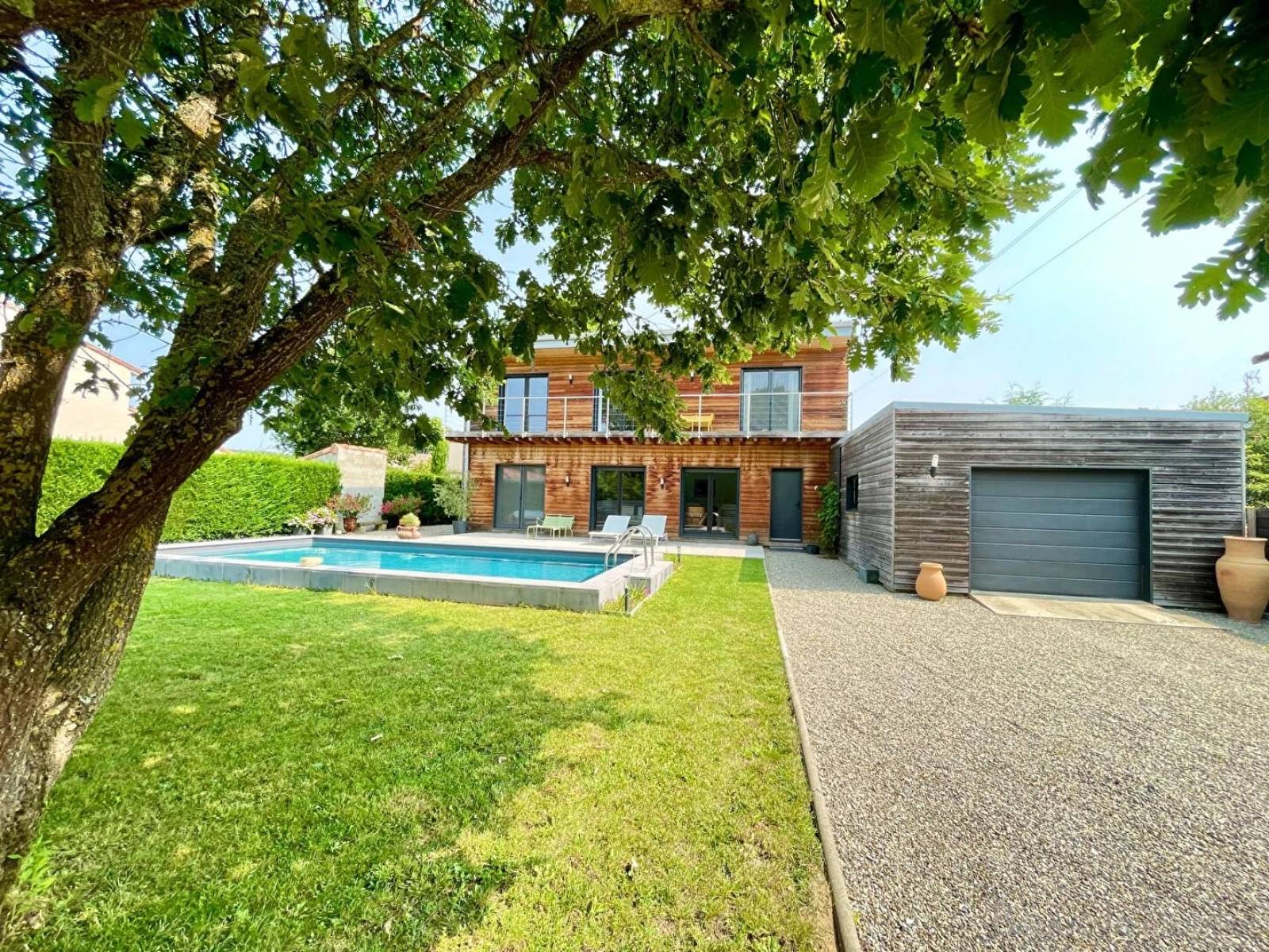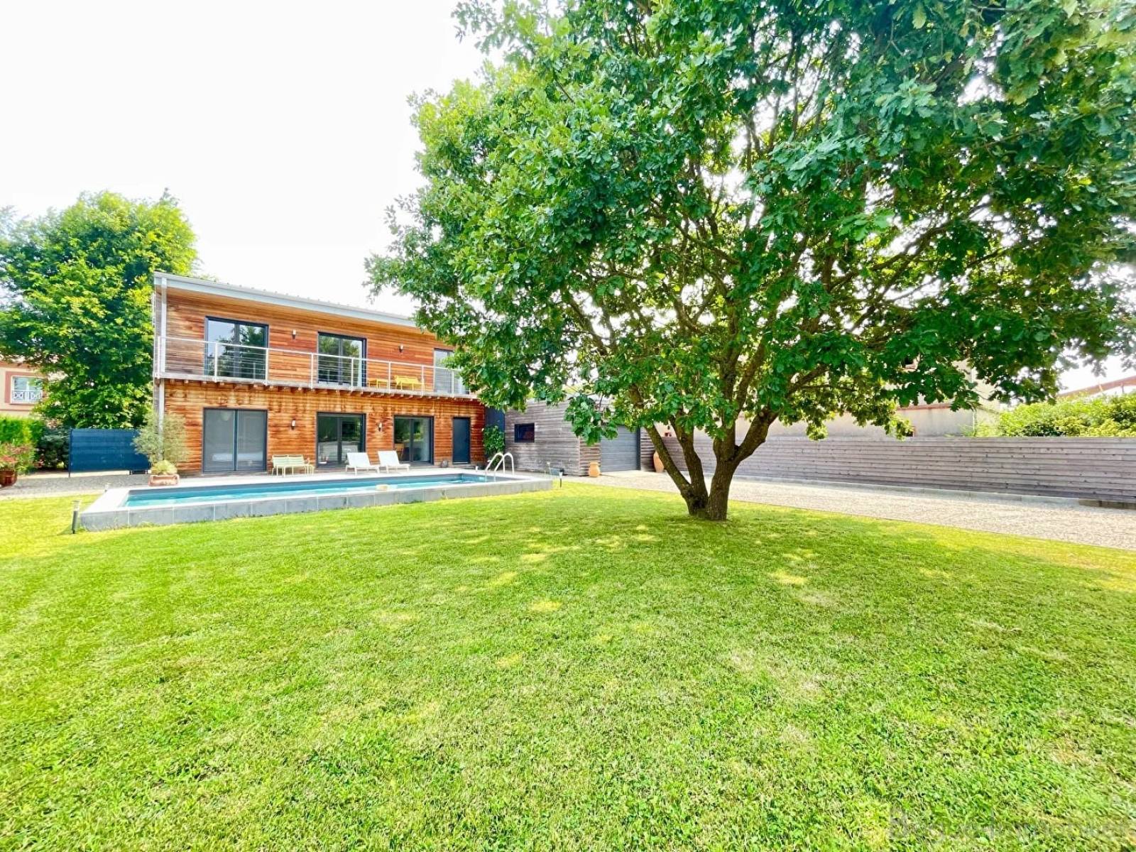 Est-il nécessaire de préciser qu'ici, nulle nuisance et aucun vis-à-vis. Une cuisine épurée complète ce bel espace de vie d'un côté quand, à l'opposé, une vaste suite parentale avec sa salle d'eau appelle au repos. Un toilette et une buanderie ont également leur place au rez-de-chaussée. A l'étage, vous découvrez une seconde suite parentale, c'est peu commun, trois autres grandes chambres (14m²), une salle de bain et un toilette. A ce niveau, vous bénéficiez d'un joli point de vue depuis la terrasse en bois, les Pyrénées s'y révèlent par temps dégagé ! Un grand garage complète l'ensemble.