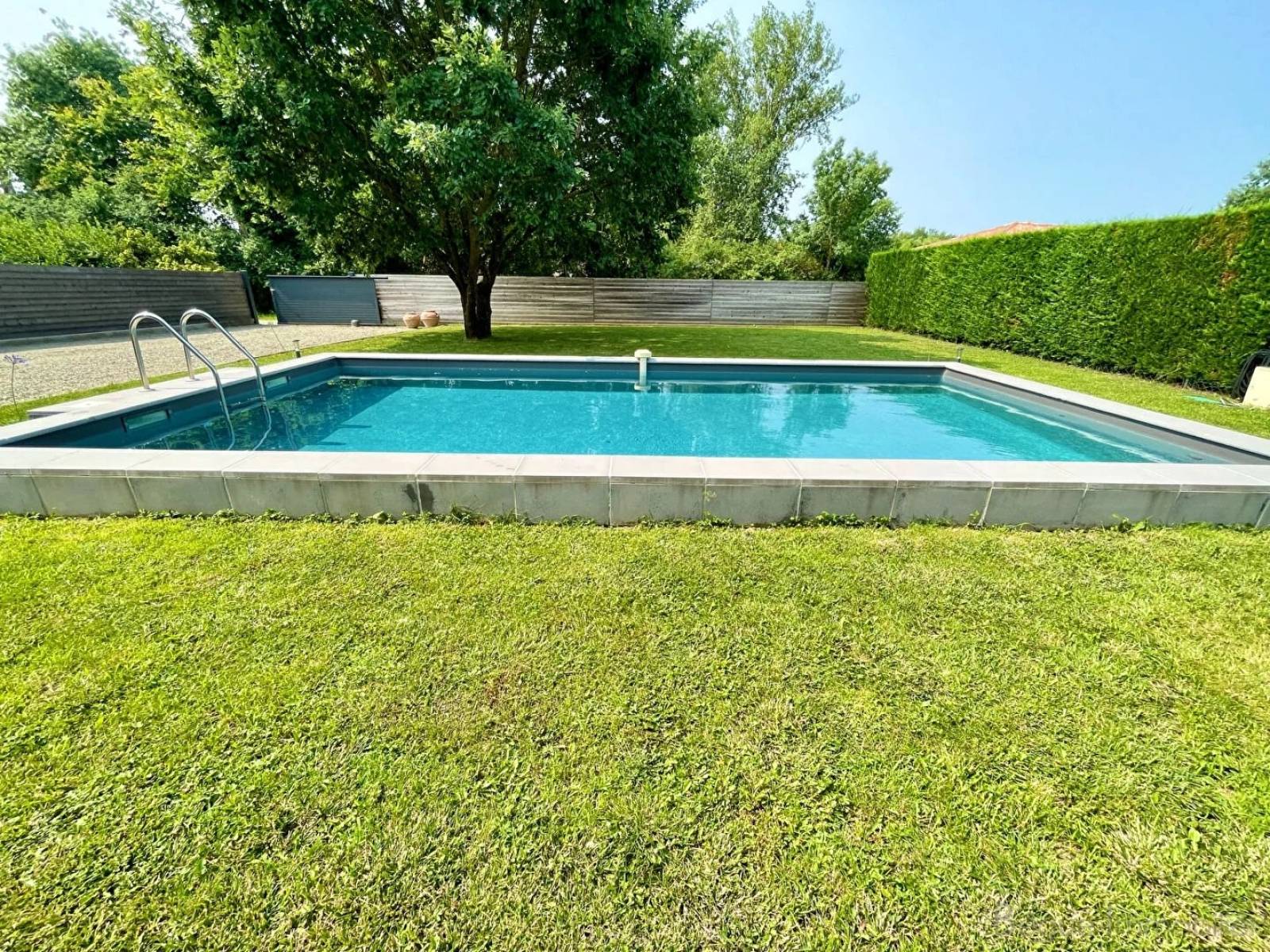Et si nous passions au jardin ? Il appelle à la rêverie. Une somptueuse piscine (8x4) vous invite à la détente quand la généreuse pelouse rendrait un green de golf jaloux. Un magnifique chêne s'y déploie, lectures ombragées assurées. Sans conteste, vous aimerez : le lieu, le calme qui y règne, les volumes, la qualité des prestations.