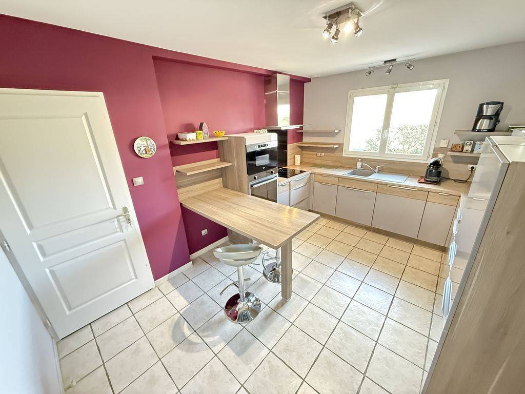 Séparée, la cuisine équipée est suffisamment grande pour y manger. Elle permet aussi un accès direct au garage.