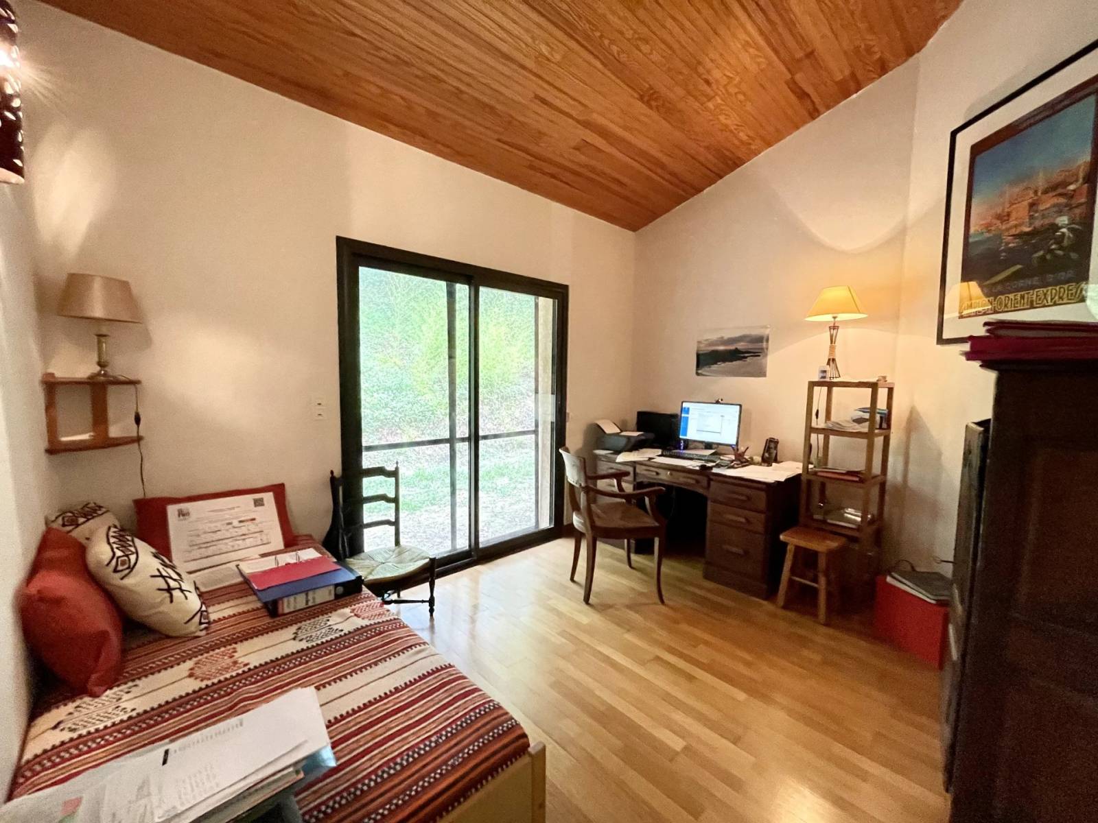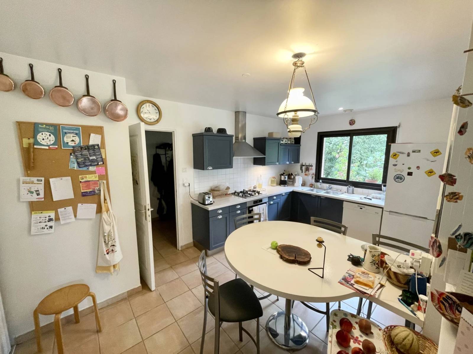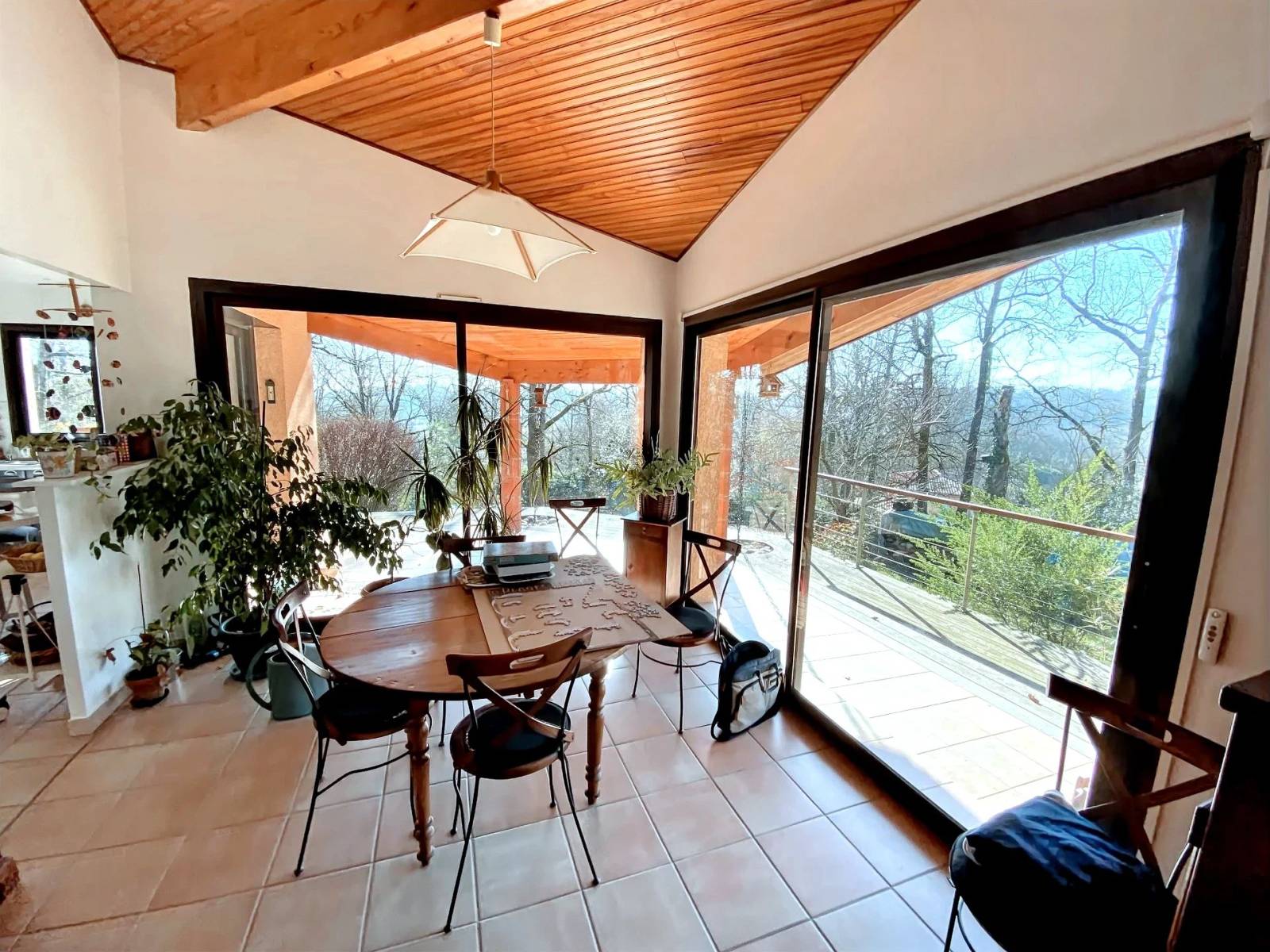 Depuis l'entrée, vous accédez à un superbe espace de vie déplafonné de près de 50m2 avec larges baies vitrées donnant sur la forêt environnante. A ses côtés, une jolie cuisine équipée prolongée par une vaste terrasse orientée sud.