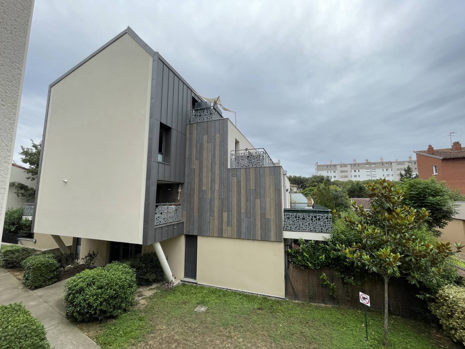 Situé en arrière plan, il profite de tous les commerces et du métro sans aucune nuisance, au calme absolu, avec vue dégagée svp.