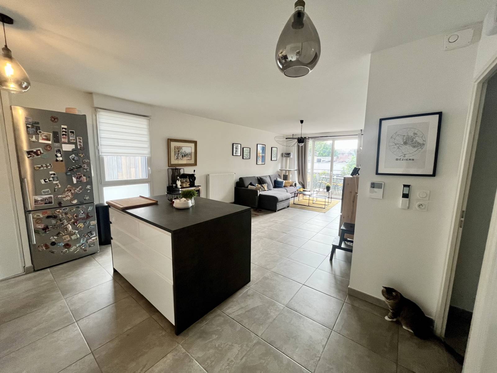 Depuis l'ascenseur vous accédez à l'appartement depuis le premier étage. Se déploie alors un bel espace de vie, très lumineux, avec cuisine équipée, dressing et un accès à une jolie terrasse deck en bois de près de 9m2 avec une belle perspective.