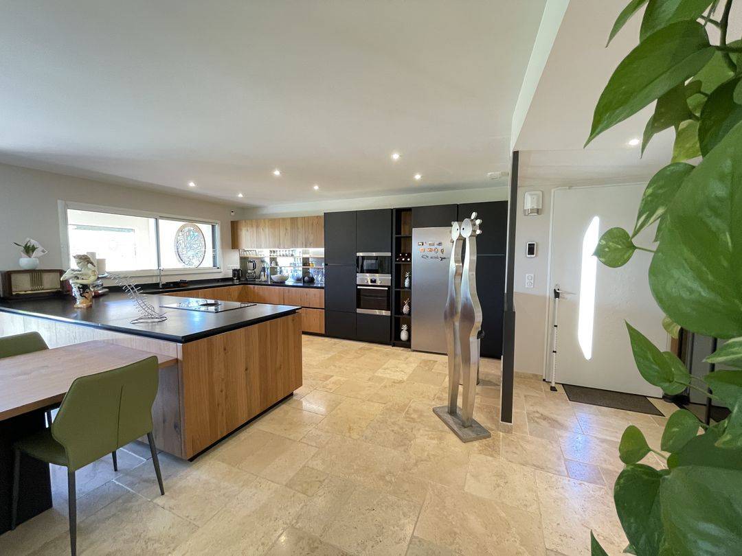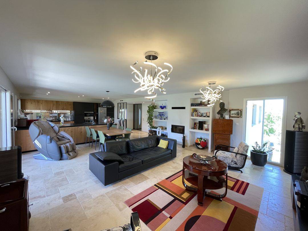 Vous profitez d'un vaste espace de vie de plus de 62 m2 où la lumière est plus que généreuse. agrémenté d'une cheminée avec insert. La cuisine est tout aussi somptueuse. Entièrement équipée. elle saura séduire les plus toqués d'entre vous. Espace prolongé par une majestueuse terrasse couverte.